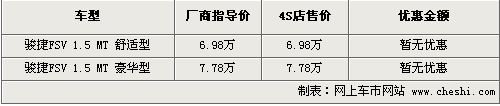 经销商透露,现在各店内的FSV基本可满足消费者的购车要求,车型及颜色也较为齐全,不再需要预订购买。问及车型的优惠,销售人员表示,由于骏捷FSV为刚刚上市的新车,所以店内暂时没有任何形式的优惠,还请消费者谅解。
