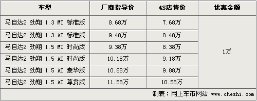 据4S店销售人员介绍,三厢优惠幅度为1万元,据销售人员介绍,选购马2的消费者多数选择2厢车,而三厢在性价比上更超值。目前豪华版和时尚版有现车供应,入门车型优惠后仅为7.68万。