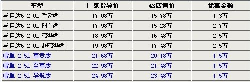 据北京地区一汽马自达4S店销售人员介绍,目前购买睿翼或马自达6均有较大的优惠幅度。睿翼车型全系优惠现金1.5万元,且现车颜色齐全,同时老款车型最高让利2.7万元,车价最低仅为15.28万元。并且购买新老车型均有装饰赠送,新老款车型消费者可以根据需求选购。北京地区各4S店由于订单不同,各店销售的现车颜色有所不同。