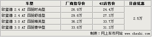 由北京地区经销商处了解到,目前欧蓝德09款最高优惠幅度达到了2.5万元,现车方面颜色较为齐全,主要有灰色、黑色等款。2010款欧蓝德目前已上市销售,但无优惠现车充足。