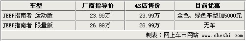 据4S店销售人员介绍:目前09款指南者北京地区无现车,但经销商处承诺将在本月15号到一批指南者运动版车型,颜色为黑色、墨绿色及金色车型,但到车数量不会太多,基本保持在5-10台。如需预定,需交订金5000元,如感兴趣请及时与店内取得联系。需要注意的是,如果购买金色及墨绿色车型,需加价5000元,由于购买此颜色消费者很多,所以采取此行为。车价方面,目前车源紧张无任何优惠,购车也不附赠任何装饰。