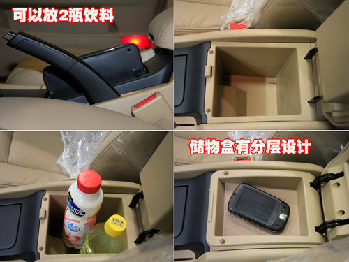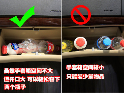 手套箱空间的确较小,虽然开口角度大,但空间不能令人满意。只能放下2个600mm的饮料瓶,这一点新景程有些令人失望。