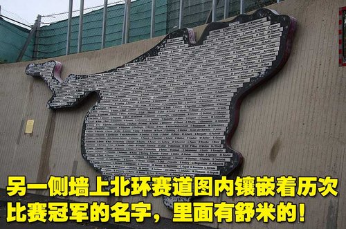 在通道尽头的墙上有一个硕大的纽博格林北环赛道的图案,而在内部写满了名字,它记录着在纽博格林赛道诞生的冠军车手,其中大名鼎鼎的舒马赫就在其中,可惜名字实在是太多了,寻觅了很久也没有找到。