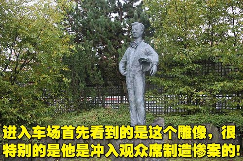 进入赛车场之后,先看到的是这样一个雕像,很多人会觉得它一定是个大人物,但实际上它是一位车手,并且是一位驾车冲向观众席导致多人死亡的车手,看来把他的雕像竖在这里估计是起警示的作用。