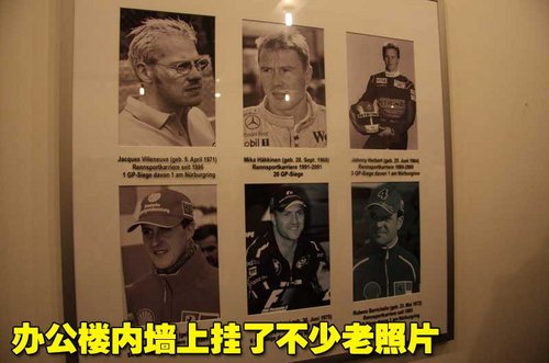 进入楼内可以看到在楼道内的墙上挂满了各种的老照片,以及往届比赛的一些宣传海报,当然少不了车手的照片,相信这个照片中人物很多人都认识,舒马赫、哈基宁都在里面。