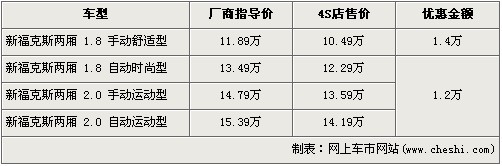 据北京福特4S店销售人员介绍:目前购买两厢福克斯的消费者最高可以得到1.4万元的优惠。1.8L手动舒适版经1.4万元优惠后,售价降到了10.49万元。1.8L自动时尚版以及2.0L的运动版车型有1.2万元的优惠,优惠后售价分别降到了12.29万元、13.59万元和14.19万元。