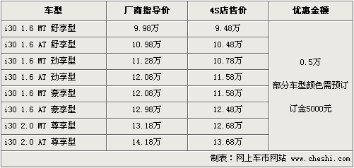 据北京现代4S店销售人员介绍,现代i30首次全系优惠5000元,店内有少量1.6舒享型及2.0顶配车型现车,颜色以红色、银色、蓝色为主。其余车型预订最快1周可提车,订金为5000元。关注此车的朋友可致电4S店详询,北京地区各4S店由于订单不同,各店销售的现车颜色有所不同。