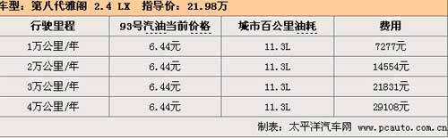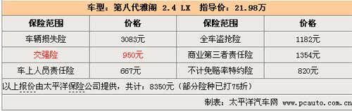 保险方面,指导价为21.98万的第八代雅阁 2.4 LX购买了第三者50万元责任险,每年的保险费用为8350元。