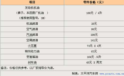 广汽本田为雅阁提供3年或十万公里的质保期限,首保是在5000公里,以后每过5000公里保养一次。与大多数日系车型相同,广汽本田对雅阁车型机油机滤更换周期的官方建议是5000公里,广汽本田4S店一般建议车主使用级别较高的SM级本田原装机油。每次常规保养用料费用为217元,加上200元的更换机油机滤工时费一共是417元。在4万公里内进行常规保养总共6次。到了2万公里的时候,车主要在常规保养基础上增加空气滤清与空调滤清的保养,保养费用也相应的增加,需要707元。而到了4万公里的时候要进行一次大保养,需要更换机油机滤、空气滤清、空调滤清、汽油滤清、火花塞与变速箱油,而保养费用也需要过千元,达到1611元。