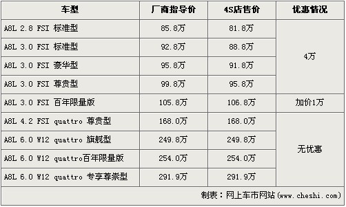 据北京奥迪经销店销售人员介绍,目前购买2.8L以及3.0L奥迪新A8L车型的消费者,可以得到4万元的现金优惠。经优惠后,全系入门级的2.8L标准型的售价从85.8万元下降到了81.8万元。而新上市的3.0L百年限量版车型店内只有一辆现车,并且提车需加1万元,售价从105.8万元上升到了106.8万元。