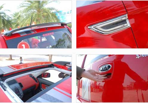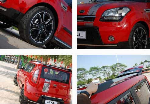 东风悦达起亚SOUL由官方提供了一套改装配件,正如您在上面照片中所看到的,包括前后保险杠、大灯下方的灯眉、18寸黑色花型轮毂、车身侧面裙边包围、后尾翼以及车身拉花,一台普通的SOUL就这样变身为了一台与众不同的SOUL,多了几分动感也多了几分张扬。