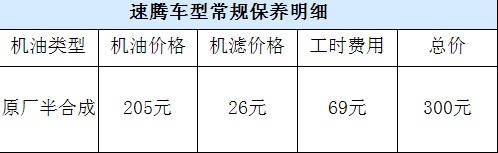 目前速腾车型在4S店内进行一次常规的机油保养的费用在300元左右,同时也享受7500-1万公里时的一次免费保养。不过,由于这款发动机已经很成熟了,因此在快修店或者专修店进行保养,费用会比4S店便宜不少。不过这里还需要说的是由于速腾的正时系统采用了皮带驱动,因此相比高尔夫6的那台发动机在后期还需多花正时系统的费用。