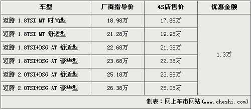 据北京一汽大众经销店销售人员介绍,迈腾全系车型全系优惠1.3万元。经1.3万元的优惠后,全系入门级的1.8TSI MT时尚型的售价从18.98万元下降到了17.68万元。全系最高配的迈腾2.0TSI豪华版经1.3万元优惠后,售价降到了25.08万元。销售人员还介绍,目前迈腾全系现车都比较充足。