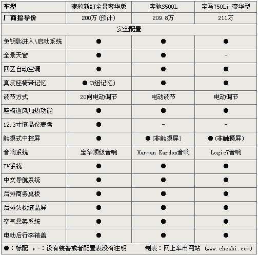 通过详细对比来看,三款车在配置齐备的情况下,又装备有各具特色的配置,而在外观上三款车的风格也很不同,应该说捷豹新XJ更有亲自驾驭的冲动,到底选择哪款车还需要您仔细斟酌一下!