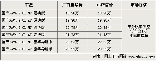据一汽丰田北京地区4S店销售人员介绍,目前该车有部分车型少量现车,由于RAV4货源比较紧张,大部分车型及颜色消需要提前预定,订车需要等待2个月的时间,也就是要到年底前才可以提到现车。如果着急购买,需加价现金一万元或在4S店购买等值的装饰。现车颜色以黑色、白色、银色为主。北京地区各4S店由于订单不同,各店销售的现车颜色有所不同。
