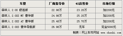 据斯巴鲁4S店销售人员介绍,目前森林人全系店内的实际销售价格比原来指导价增加了2248元,主要原因是全系增加了倒车雷达以及尾喉配置。目前2.0XS自动导航版和2.5XS两款车型均有现车供应,颜色主要为蓝色、白色、红色、黑色。部分颜色及车型还需要预订,订金为5000元,最快一个月可以提到车。另据介绍,2.0XS豪华导航版已停止生产。北京地区各4S店由于订单不同,各店销售的现车颜色有所不同。