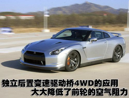 日产专门为GT-R开发了世界上第一个独立后置变速驱动桥4WD,通过碳纤维推进器与尾部驱动装置相结合,同时降低整车的中心,从而大大降低了前轮的空气阻力;采用了大直径缺气保用轮胎,增加轮胎抓地面积;同时,电脑控制6挡双离合变速器、新型的悬挂系统、强大的制动系统、完美平衡四轮负载,改善了转弯的效能和稳定性。