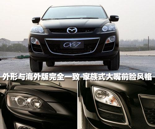 前脸采用了马自达新一代大嘴设计,较大的进气格栅以及更加突出的车标。前保险杠中的镀铬边框使CX-7更加时尚与运动,黑底大灯内采用远近光分体设计,近光装备了透镜氙灯。强劲有力的翼子板在车身中部得以适量的过度,其在车尾部再次伸张,配以车窗周围的镀铬装饰条,赋予了CX-7更为前卫的定义。车身整体线条设计流畅圆润,反光镜集成了LED转向灯。