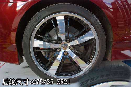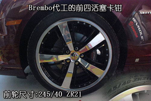 2010款雪佛兰Camaro全系共分为5款车型,除了最低配车型配备钢轮毂以外,其他车型均装配了轮合金轮毂(此次拍摄车辆为全系最高配车型)。轮合金轮毂的造型虽然看起来很平凡,但是五幅式的亮银粗轮幅与十幅式黑色细轮幅相间的效果还是会让人流连忘返的。2010款雪佛兰Camaro前轮的尺寸为245/40 ZR21,后轮的尺寸为275/35 ZR21,由于Camaro是后驱车型,为了增强抓地力所以驱动轮的横向截面积会大于前轮的横向截面积。前后刹车卡钳均是由意大利著名的刹车系统生产厂商Brembo代工而成,这么一部凶猛的机器没有一套能抑制它的刹车系统怎么能行呢!