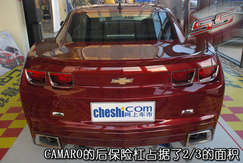 转到车尾,Camaro的尾部虽然非常饱满,但是有棱有角的“飞镖式”造型始终是贯穿全车。后保险杠造型极其夸张,巨大的后保险杠整整占据了车尾2/3的面积,如果行驶在道路上不知道后车看见如此震撼的车尾还有没有胆量踩下油门。