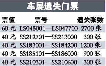 这5400张车展门票是在19日晚间遗失的,车展主办方已经报案。涉及面值分别有60元和40元两种,各有2700张。