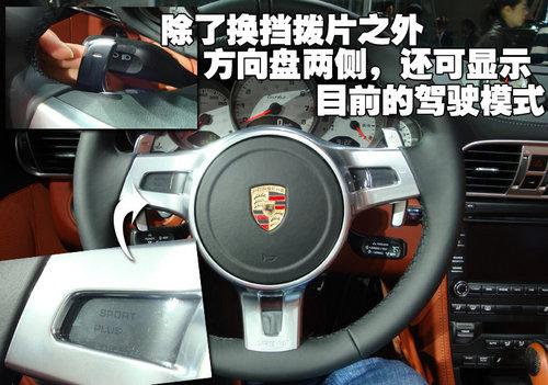 配备PDK双离合变速器的2010款保时捷911 Turbo敞篷版,可以通过选装带有换档翘板开关的新款选装三辐方向盘取代带有传统换档按钮的标准方向盘。换档翘板开关牢固安装在方向盘上,右侧的翘板开关用来升档,左侧的翘板开关用来降档。