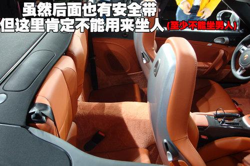 2010款保时捷911 Turbo敞篷版前排座椅为一体式运动型座椅,支撑有力且皮质手感舒适。除座椅下方的电动调节按钮外,在椅背侧面还设计了手动扳手,从而方面后排乘客上下车。由于双后座受到流线车体缩减的局促空间,并不适合体型略壮硕的成人长途乘坐。