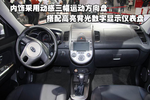 SOUL的内饰上突出了强烈的未来感和科技感,三幅运动方向盘配合高亮背光数字显示仪表盘,中控台温馨的色调设计加上夜晚会发出荧光的座椅。AUX & USB接口可以接入各种多媒体载体,前门两侧的音响发光系统随着音乐有节奏地律动,配上环绕全车的8声道喇叭带来的完美音效表现和集成了常用控制按钮的方向盘,在车内就能轻松玩转音乐时尚。