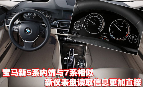 宝马新5系的内饰与7系有些相似,新款仪表盘让驾驶员读取信息更加直接。而第四代宝马iDrive系统和6速电子手自一体变速箱,也均成为宝马新5系的标准配置。