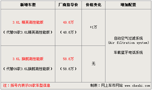 3.6L两款车型虽然在发动机上并没有任何改变,但增加了自动空气过滤系统(Air filtration system)和车载蓝牙电话系统2项舒适性配置,并标配了19英寸铝合金轮圈。价格方面,3.6L精英高性能版在09款车型48.8万元的基础上增加了1万元,为49.8万;而3.6L旗舰高性能版车型价格没有变化,依旧是58.8万。