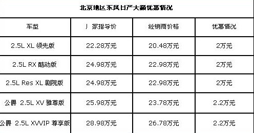近日,笔者从东风日产北京经销店了解到,新天籁2.5车型最高将优惠2.2万,并且4S店有现车,提车速度较快,这对那些准备出手新天籁的北京朋友的确是一个好消息。