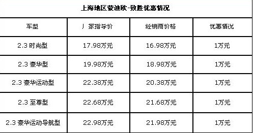 近日,中级运动型家轿蒙迪欧-致胜(报价 参数 图片 论坛)目前在上海也抛出了1万元的现金优惠,同时还可获赠价值千元的装潢礼包。但在由于目前正值年关4S店内现车普遍储备不足,因此消费者不能立即提车没有现车,但是,消费者也可以选择预定,提车时间则要视车型和颜色而定。
