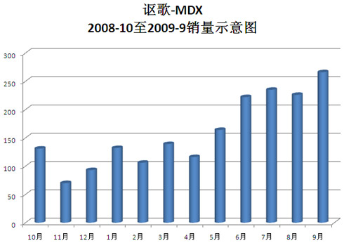 讴歌MDX是继讴歌TL和RL两款轿车引入国内之后的第三款车型,讴歌MDX投放国内市场后,一改讴歌TL和RL轿车平淡的销量表现。通过上表近一年的销量可以看出,讴歌MDX单月最高销量已经超过250台,并且表现强劲的上升态势。