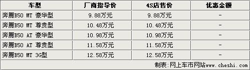 据一汽奔腾4S店销售人员介绍,奔腾B50目前的销售情况非常好,但现在所有车型颜色均不是很全,部分颜色仍需要预订。消费者如果预订奔腾B50,需要交付1000元订金,而且B50自上市起到现在一直没有任何优惠活动。而3G版车型则一直处于无车的状态,还请消费者谅解。