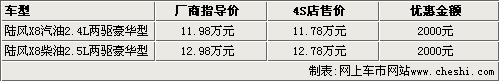 9月17日,陆风首款城市型SUV正式在江西南昌发布上市,共推出两款车型,分别是豪华汽油版和豪华柴油版,其中汽油版售价11.98万元,而柴油版售价12.98万元。目前陆风X8虽然已经正式上市,但在4S店出现车还不全,现金优惠2000元。