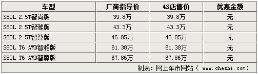 据沃尔沃4S店销售人员介绍,目前国产2010款S80L全系车型已经到店,处部分颜色无车需要消费者订车,订金为5万元;除此之外全系车型基本可以满足购车需要。2010款车型中,有三款车型因增配而在价格上相比09款车型有所提升。