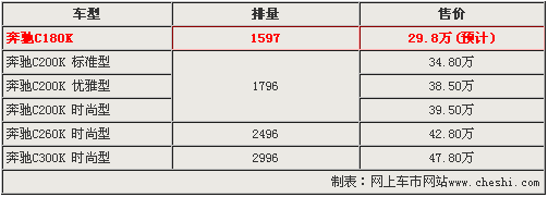 目前,北京奔驰新C级轿车共有3个排量五款车型,而入门级车型奔驰新C200K 标准型的售价为34.8万元。由于奔驰新C200K 标准型在经销商处可以优惠2万元左右,所以奔驰新C180K车型作为奔驰新车的入门车型,预计售价为29.8万元。同时,与售价分别为28.3万和29.1万的宝马318i和奥迪A4L1.8T形成真正的抗衡。