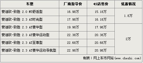 据4S店销售人员介绍:在售的蒙迪欧-致胜共有6款车型,近期购买的消费者最高可以得到2万元的优惠。入门级的2.0L手动舒适版以及2.3L自动时尚版经1.8万元的优惠后,售价分别降为了15.18万元和16.18万元。2.3L豪华运动版、至尊版以及豪华运动导航版经全系最高的2万元优惠后,售价分别降为了20.38万、20.68万以及20.98万元。