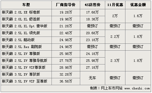笔者了解,相比11月份的优惠幅度,目前新天籁价格最高优惠仅为1.8万元,上个月的最高优惠则为2.3万元,但是现车供应情况仍然比较紧张,除了标准版和舒适版有部分可选择外,2.5升的部分车型仍需要订购,月底将到一批新车。入门级优惠后售价为17.68万。