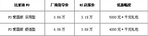 2010年关于购置税的政策出台,原来一半的购置变成了75折。近日,车天下编辑从云南森迪获悉,目前购比亚迪F0车型除现车供应外,还可享受最高5000元让利和千元礼包的赠送。