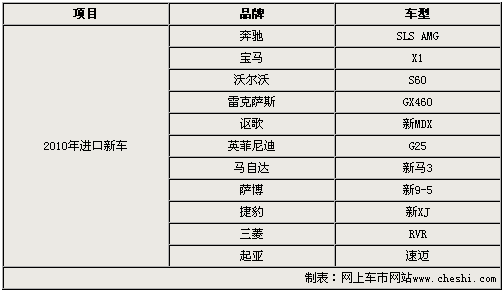 随着国内乘用车市场的迅猛发展,各个汽车生产商纷纷将新产品不断引入国内。在2010年将有多达有53款新车相继上市发布,其中不仅有奔驰SLS AMG、宝马X1、雷克萨斯GX460和英菲尼迪G25等11款进口车型,而且还有以宝马新5系、国产Q5、东本新CR-V、北京现代ix35和瑞麒G6为代表的合资及自主车型。通过以下的详实解析,让我们提前一睹它们的风采。
