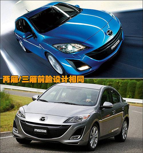 两厢版新马自达3前脸与三厢车型相同,都全面继承了新款马自达6的设计元素。无论在整体线条,还是细节处理上,都似乎是马自达6的缩小版。只是侧面线条改进不大。鉴于三角形与菱形之间的新头灯显得十分锋利。前侧进气口被有意的夸大,前散热器格栅也采用了一体化设计。使得前脸运动感十分强烈,同时灵性十足。尾部设计同样饱满、有力。上挑的大尺寸尾灯显得十分张扬,车灯内不构造也值得称道。同时,后保险杠也增加了几处凸凹的线条,大尺寸排气筒设计,使得尾部力量感十足。