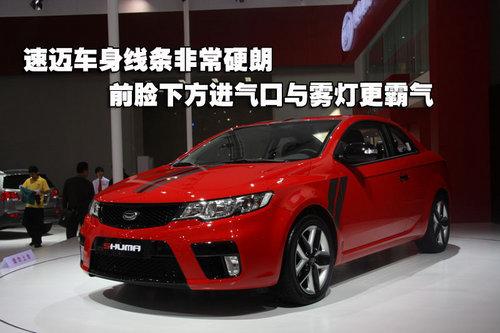 起亚速迈的车身尺寸达到4480×1765×1400mm,轴距更达到了2650mm的水平,这个数值在与竞争对手如现代劳恩斯酷派等车型相比也不落下风。起亚速迈的前脸区别于家族传统的面孔,新款不规则的晶钻前大灯边角十分犀利,酷似“虎口”的格栅设计十分稳重,黑色的中网和外圈镀铬装饰恰到好处的衬托出了起亚KOUP运动的定位。为配合车身整体风格,起亚速迈车型所采用的五角星式轮毂设计也十分硬朗,并且采用了215/45R17尺寸的轮胎,充分的考虑到了运动性和经济型。