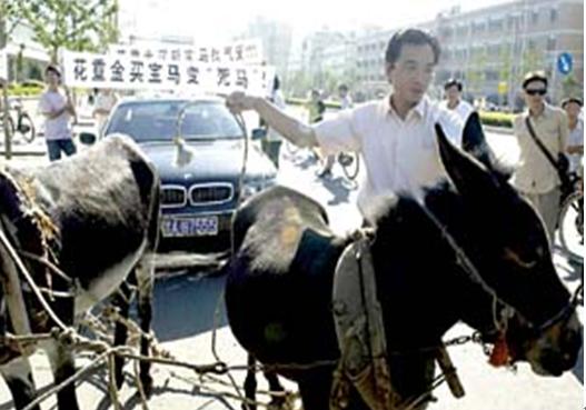 见过毛驴拉破车,但这毛驴拉高级轿车还是头一遭,看清楚了,这回人家拉的可是二百多万的宝马760。在北京四季青桥附近,来自哈尔滨的林先生赶着3条毛驴拉着一辆宝马760轿车。据他介绍,花200多万元买的这辆宝马车,一年不到的时间,汽车开始陆续出现安全气囊、刹车间歇失灵等11项故障,经维修没有改善。万般无奈之下,林先生才想出了此招——在北京街头上演一出“毛驴拉宝马”的好戏,希望能找到解决的办法。