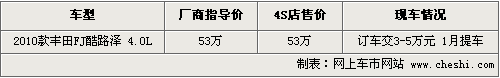 据4S店销售人员介绍,目前2010款Fj酷路泽已经有部分黑色展车到店。全系车型共有宝石绿、炫金黄、汉玉白、钛白银、玛瑙红、琥珀金、紫钻黑7款颜色可供选择。现在订车的话最快1月份可到车,如果订购汉玉白、钛白银这样较为少见的颜色则需2月份左右才能提车。目前订金为3万元-5万不等。
