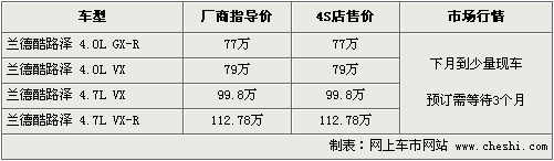 据4S店销售人员介绍,兰德酷路泽因价格较贵,均已订单式销售,所有车型需预订,订金为1万元,需等待3个月左右时间。另据介绍,下月会有一台白色顶配版现车到店。对此车感兴趣的朋友可咨询经销商处,北京地区各4S店由于订单不同,各店销售的现车颜色有所不同。