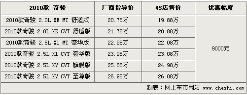 奇骏2010款全车系音响系统升级为数码6碟高保真剧院CD+Audio音响系统,并新增了一款奇骏至尊版,拥有车身包围套装、5.8英寸彩色触摸显示屏、智能语音导航系统、高保真剧院音响系统、侧可视系统、倒车影像监视系统、可伸缩行李厢遮物帘等七大亮点配置。在银色、黑色等颜色的基础上,奇骏2010款还增加了玛瑙红车色,更显时尚、动感。