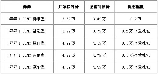 如果说,10万元左右的紧凑型家用车是合资品牌的必争之地,那么,5万元以下的微型车就是自主品牌的天下了。虽然有F0和熊猫、QQ这一系列大敌当前,但奔奔在昆明市场还是占有一席之地的。近日,车天下编辑从云南万友长安汽车经销商处获悉,奔奔系列有1000-2000元不等的现金优惠,同时还可获得万友送出的7重大礼包。