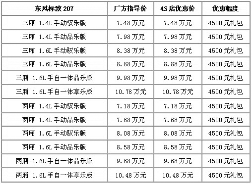近日,车天下编辑从云南都市车迷宝狮标致专营店获悉,目前购标致207全系车型,不但可以享受全现车供应,更能享受到4500元随车大礼包赠送。这在今年的年末显得难能可贵,具体车型及详细优惠政策,如下表: