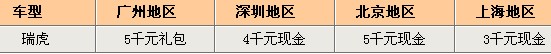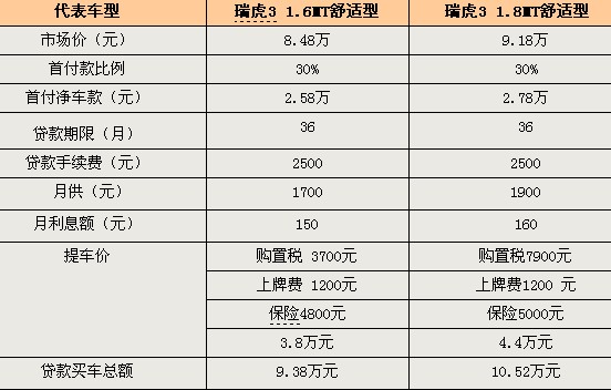 作为国内唯一一款横跨轿车、SUV和MPV市场的常青树车型,瑞虎从05年上市至今的4年间已经进行了200多项改进和升级,整车品质正日趋完美。瑞虎这款车也是首付三成三年贷款的方案比较受亲睐,首付净车款还不到3万块钱,三年所要支付的利息多的只要1.3万元,少的则只需要9千块钱。